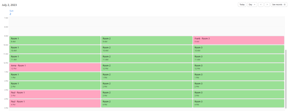 An Airtable system with two interfaces: one for "front end" users in to book meeting rooms by selecting from available slots; the other for "back end" users (receptionists, administators, assistants) to support users with their bookings and display all scheduled bookings on a calendar